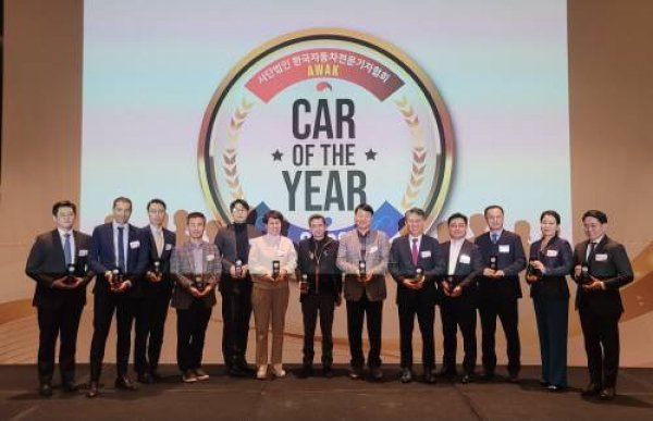 한국자동차전문기자협회 ‘2023 대한민국 올해의 차’ 시상식에서 수상자들이 기념촬영을 하고 있다. 사진제공|한국자동차전문기자협회