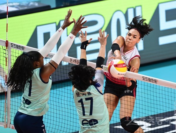 12일 서울 장충체육관에서 열린 ‘2022-2023 도드람 V-리그’ 여자부 서울 GS칼텍스와 대전 KGC인삼공사의 경기에서 KGC인삼공사 엘리자벳이 GS칼텍스 블로커 앞에서 스파이크를 하고 있다.