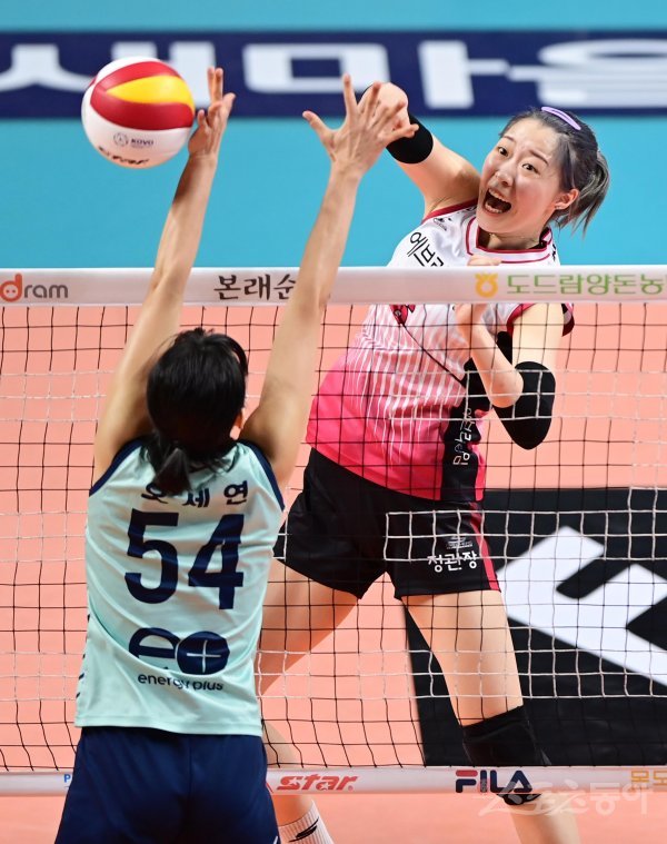 12일 서울 장충체육관에서 열린 ‘2022-2023 도드람 V-리그’ 여자부 서울 GS칼텍스와 대전 KGC인삼공사의 경기에서 KGC인삼공사 박은진이 GS칼텍스 블로커 앞에서 스파이크를 하고 있다.