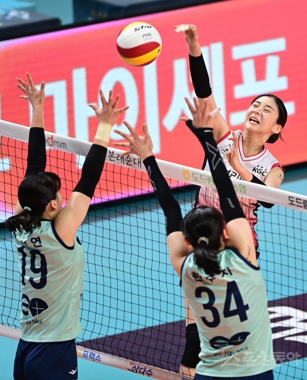 12일 서울 장충체육관에서 열린 ‘2022-2023 도드람 V-리그’ 여자부 서울 GS칼텍스와 대전 KGC인삼공사의 경기에서 KGC인삼공사 박혜민이 GS칼텍스 블로커 위로 스파이크를 하고 있다.