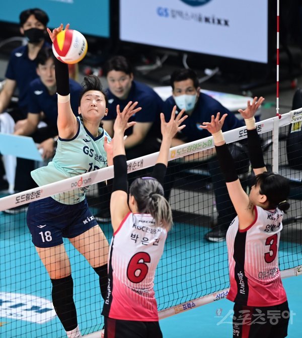 12일 서울 장충체육관에서 열린 ‘2022-2023 도드람 V-리그’ 여자부 서울 GS칼텍스와 대전 KGC인삼공사의 경기에서 GS칼텍스 권민지가 KGC인삼공사 블로커 앞에서 스파이크를 하고 있다.