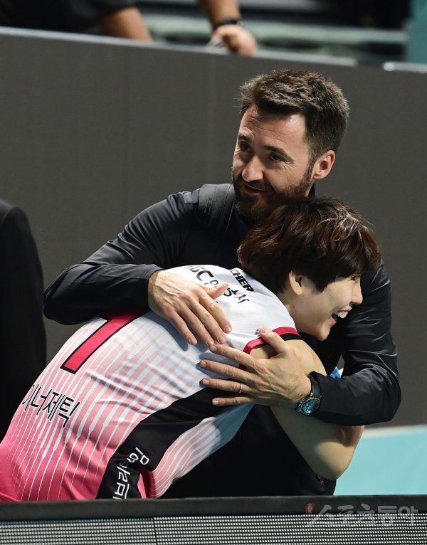 12일 서울 장충체육관에서 열린 ‘2022-2023 도드람 V-리그’ 여자부 서울 GS칼텍스와 대전 KGC인삼공사의 경기에서 세자르 곤잘레스 감독이 KGC인삼공사 이소영과 인사를 하고 있다.