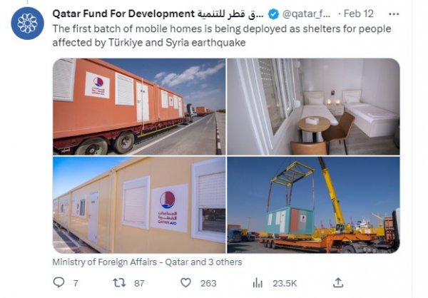 카타르 개발 기금도 이날 트위터를 통해 지진 피해 지역에 1만 채의 이동식 주택 지원을 약속했다고 밝혔다.