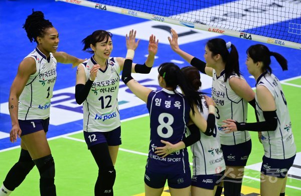 14일 수원실내체육관에서 열린 ‘2022-2023 도드람 V-리그’ 여자부 수원 현대건설과 김천 한국도로공사의 경기에서 득점에 성공한 캣벨과 문정원이 동료들과 기쁨을 나누고 있다.