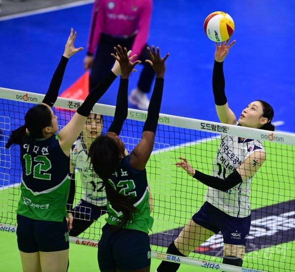 14일 수원실내체육관에서 열린 ‘2022-2023 도드람 V-리그’ 여자부 수원 현대건설과 김천 한국도로공사의 경기에서 한국도로공사 배유나가 현대건설 블로커 앞에서 밀어넣기 공격을 하고 있다.