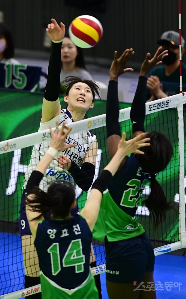 14일 수원실내체육관에서 열린 ‘2022-2023 도드람 V-리그’ 여자부 수원 현대건설과 김천 한국도로공사의 경기에서 한국도로공사 박정아가 현대건설 블로커 앞에서 스파이크를 하고 있다.