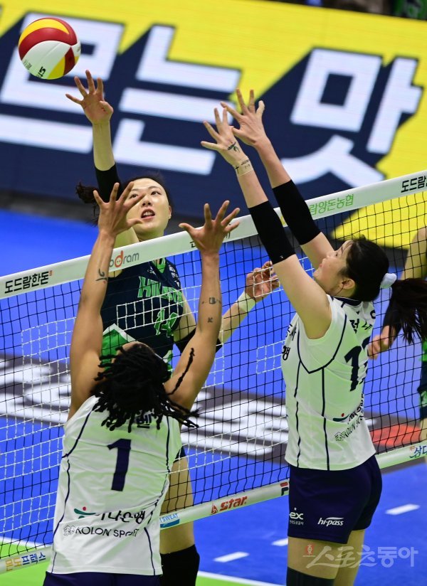 14일 수원실내체육관에서 열린 ‘2022-2023 도드람 V-리그’ 여자부 수원 현대건설과 김천 한국도로공사의 경기에서 현대건설 양효진이 한국도로공사 블로커 앞에서 스파이크를 하고 있다.