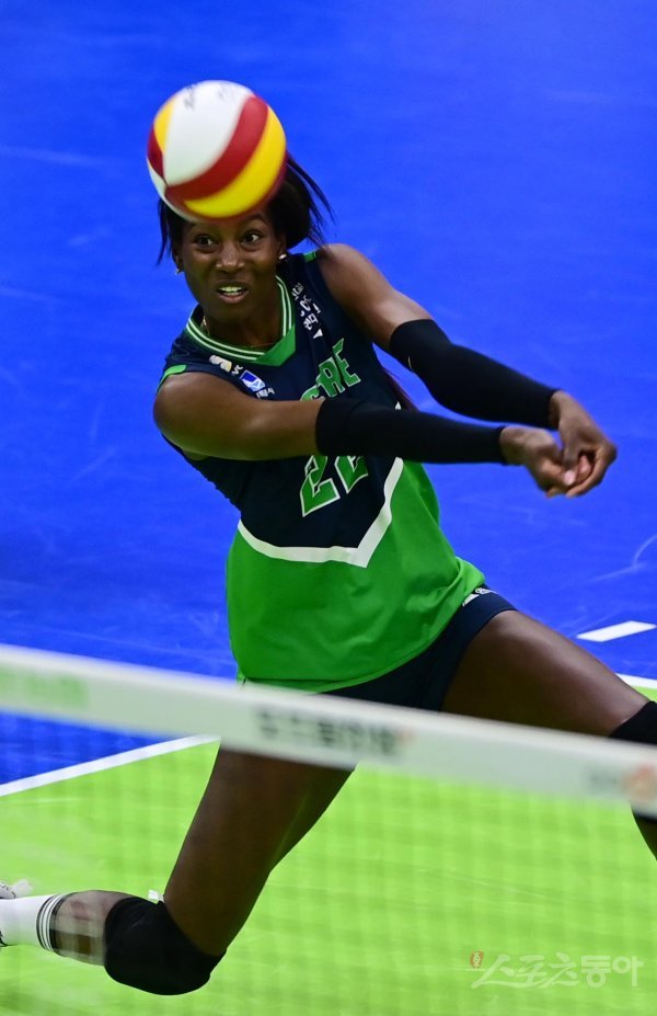 14일 수원실내체육관에서 열린 ‘2022-2023 도드람 V-리그’ 여자부 수원 현대건설과 김천 한국도로공사의 경기에서 현대건설 몬타뇨가 리시브를 하고 있다.