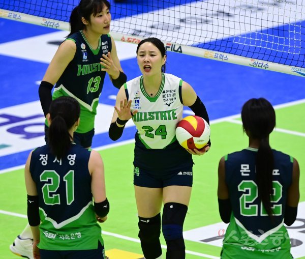 14일 수원실내체육관에서 열린 ‘2022-2023 도드람 V-리그’ 여자부 수원 현대건설과 김천 한국도로공사의 경기에서 현대건설 김주하가 실점 후 동료들과 이야기하고 있다.