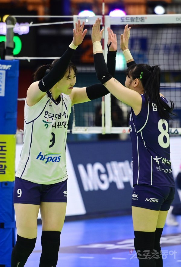 14일 수원실내체육관에서 열린 ‘2022-2023 도드람 V-리그’ 여자부 수원 현대건설과 김천 한국도로공사의 경기에서 세트스코어 3-1로 승리한 한국도로공사 박정아가 동료와 기쁨을 나누고 있다.