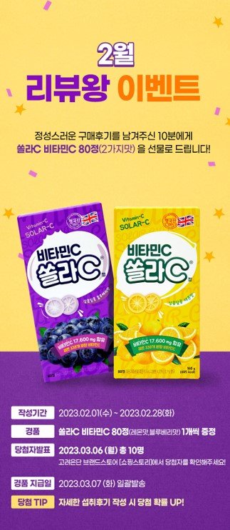 이벤트 참여자 중 10명을 선정해 ‘고려은단 비타민C 쏠라C 정’ 레몬맛과 블루베리맛 80정을 1개씩 경품으로 증정한다. 사은품인 ‘고려은단 비타민C 쏠라C 정’은 츄어블 타입의 비타민C 캔디로, 한 정에 DSM사의 프리미엄 영국산 비타민C가 220mg을 함유했다.