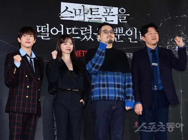 배우 임시완, 천우희, 감독 김태준, 김희원이 15일 서울 광진구 광장동 롯데시네마 건대입구점에서 열린 넷플릭스 ‘스마트폰을 떨어뜨렸을 뿐인데’ 제작보고회에서 포즈를 취하고 있다.