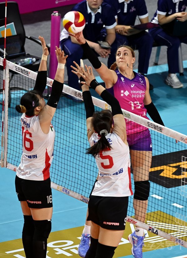 15일 인천 삼산월드체육관에서 ‘2022-2023 도드람 V리그’ 인천 흥국생명과 광주 페퍼저축은행의 여자부 경기가 열렸다. 흥국생명 옐레나가 페퍼저축은행 블로커를 피해 공격을 펼치고 있다.