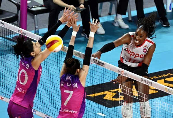 15일 인천 삼산월드체육관에서 ‘2022-2023 도드람 V리그’ 인천 흥국생명과 광주 페퍼저축은행의 여자부 경기가 열렸다. 페퍼저축은행 니아 리드가 흥국생명 블로커를 피해 스파이크를 날리고 있다.