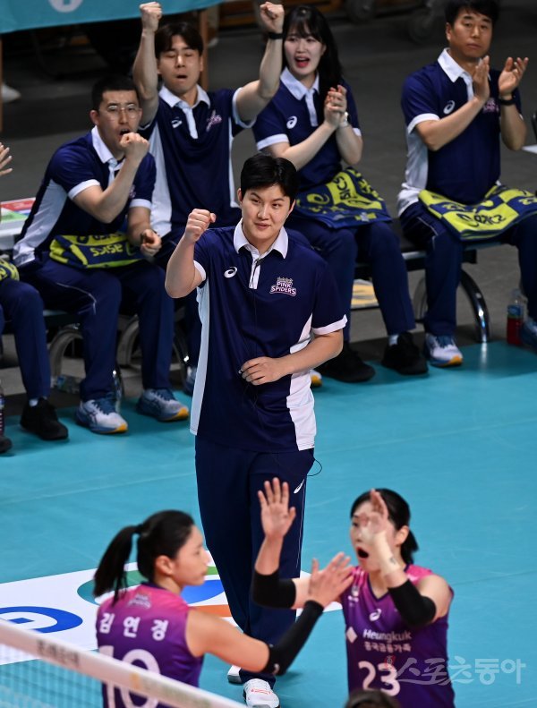 19일 서울 장충체육관에서 ‘2022-2023 도드람 V리그’ 서울 GS칼텍스와 인천 흥국생명의 여자부 경기가 열렸다. 흥국생명 김대경 감독대행이 득점 후 주먹을 쥐며 환호하고 있다.