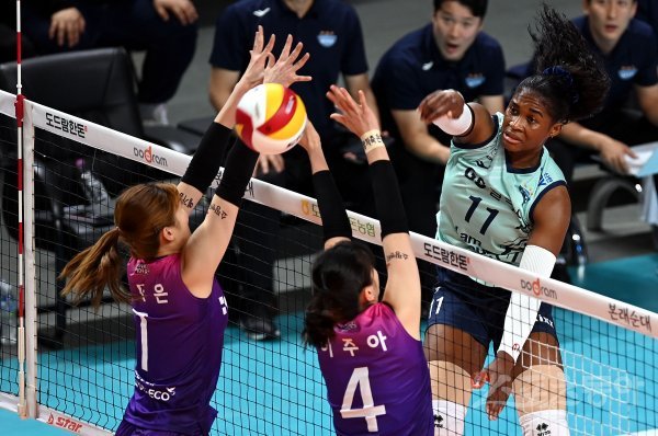 19일 서울 장충체육관에서 ‘2022-2023 도드람 V리그’ 서울 GS칼텍스와 인천 흥국생명의 여자부 경기가 열렸다. GS칼텍스 모마가 흥국생명 블로킹을 피해 스파이크를 날리고 있다.