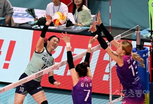 19일 서울 장충체육관에서 ‘2022-2023 도드람 V리그’ 서울 GS칼텍스와 인천 흥국생명의 여자부 경기가 열렸다. GS칼텍스 강소휘가 흥국생명 블로킹을 피해 스파이크를 날리고 있다.