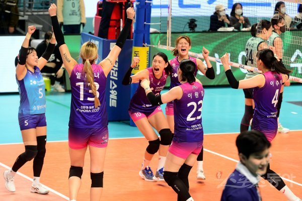 19일 서울 장충체육관에서 ‘2022-2023 도드람 V리그’ 서울 GS칼텍스와 인천 흥국생명의 여자부 경기가 열렸다. 흥국생명이 GS칼텍스를 상대로 세트스코어 3-1로 승리한 후 선수들이 코트에서 기쁨을 나누고 있다.