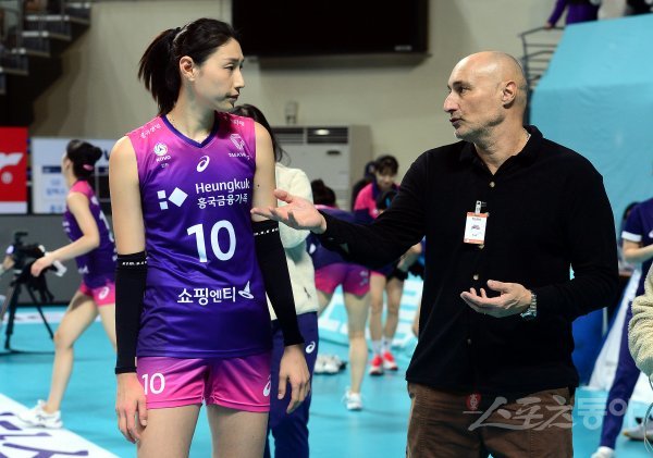19일 서울 장충체육관에서 ‘2022-2023 도드람 V리그’ 서울 GS칼텍스와 인천 흥국생명의 여자부 경기가 열렸다. 흥국생명이 GS칼텍스를 상대로 세트스코어 3-1로 승리한 후 김연경과 아본단자 감독이 이야기를 나누고 있다.