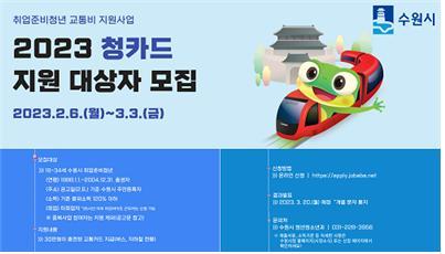 경기 수원시가 ‘2023년 취업준비청년 교통비 지원사업(청카드 사업)’ 지원 대상자 400여 명을 다음달 3일까지 모집한다고 20일 밝혔다.