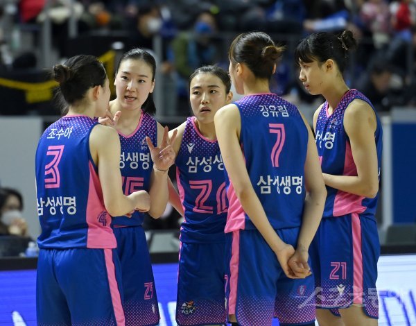 20일 용인실내체육관에서 열린 ‘신한은행 SOL 2022~2023 여자프로농구’ 삼성생명과 KB스타즈 경기에서 삼성생명 배혜윤이 팀 동료들과 이야기하고 있다.