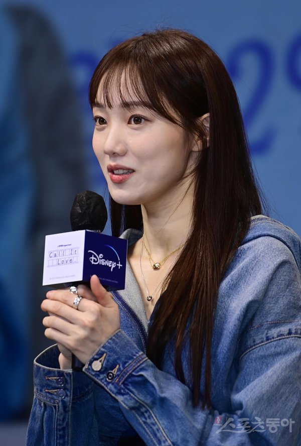 배우 이성경이 21일 서울 종로구 JW메리어트동대문스퀘어서울에서 열린 디즈니플러스 ‘사랑이라 말해요’ 제작발표회에서 인사말을 하고 있다.