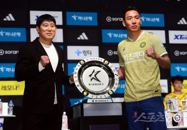 21일 서울 양재동 더케이호텔 서울에서 열린 ‘하나원큐 K리그2 2023 개막 미디어데이’에 참석한 김포FC 고정운 감독과 이상욱이 포즈를 취하고 있다.