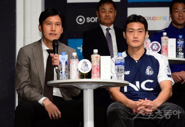 21일 서울 양재동 더케이호텔 서울에서 열린 ‘하나원큐 K리그2 2023 개막 미디어데이’에 참석한 서울이랜드 박충균 감독과 한용수가 출사표를 밝히고 있다.