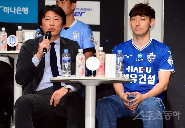 21일 서울 양재동 더케이호텔 서울에서 열린 ‘하나원큐 K리그2 2023 개막 미디어데이’에 참석한 충남아산FC 박동혁 감독과 박세직이 출사표를 밝히고 있다.