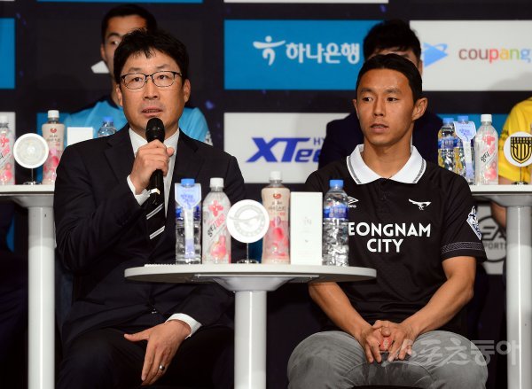 21일 서울 양재동 더케이호텔 서울에서 열린 ‘하나원큐 K리그2 2023 개막 미디어데이’에 참석한 성남FC 이기형 감독과 심동운이 출사표를 밝히고 있다.
