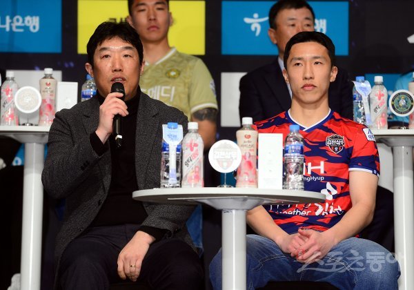 21일 서울 양재동 더케이호텔 서울에서 열린 ‘하나원큐 K리그2 2023 개막 미디어데이’에 참석한 김천상무 성한수 감독과 이영재가 출사표를 밝히고 있다.