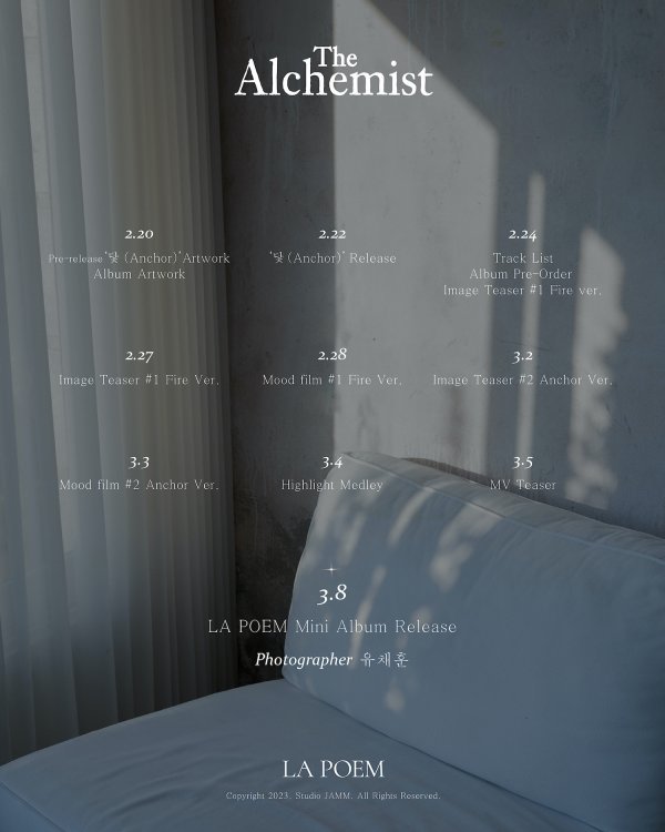 스케줄러에 따르면, 라포엠은 오는 22일 선공개곡 \'닻 (anchor)\'을 발매한다. 이어 컴백 전까지 트랙리스트, 두 가지 버전의 티저 이미지, 하이라이트 메들리, 뮤직비디오 티저 등 다양한 티징 콘텐츠를 순차적으로 선보인다.