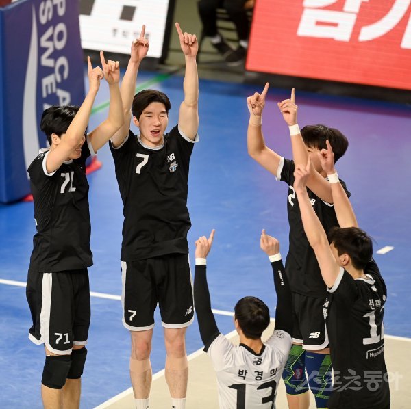 21일 천안유관순체육관에서 열린 ‘2022~2023 도드람 V-리그’ 남자부 현대캐피탈과 우리카드 경기에서 현대캐피탈 허수봉이 팀 서브 득점에 기뻐하고 있다.
