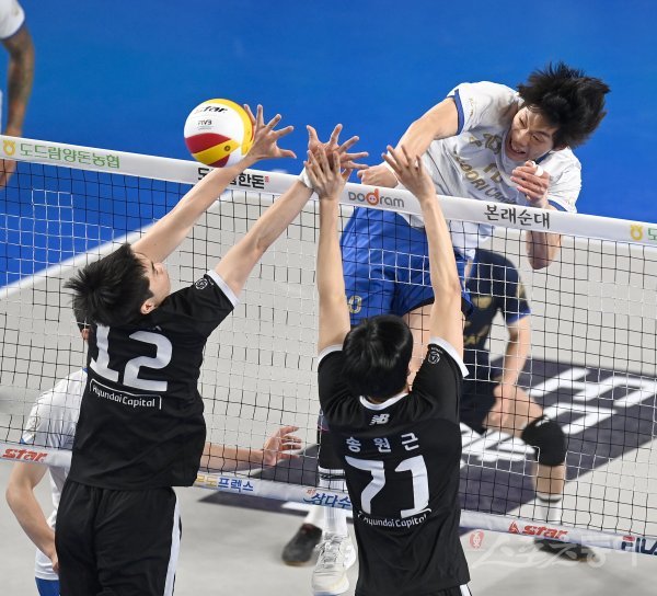 21일 천안유관순체육관에서 열린 ‘2022~2023 도드람 V-리그’ 남자부 현대캐피탈과 우리카드 경기에서 우리카드 이상현이 현대캐피탈의 블로킹 사이로 스파이크를 날리고 있다.