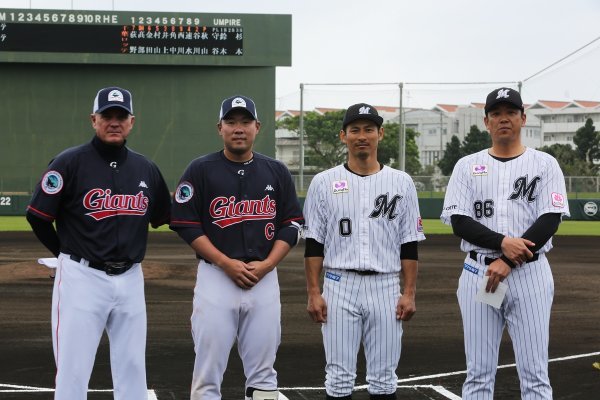 22일 일본 오키나와현 이시가키의 이시가키시영구장에서 1차 교류전을 펼친 롯데 래리 서튼 감독과 주장 안치홍, 지바롯데의 오기노 다카시, 오무라 사부로 2군 감독(왼쪽부터). 사진제공 | 롯데 자이언츠