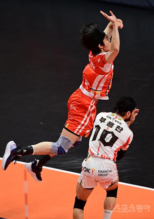 22일 안산 상록수체육관에서 열린 ‘2022-2023 도드람 V-리그’ 남자부 안산 OK금융그룹과 인천 대한항공의 경기에서 OK금융그룹 이민규와 부용찬이 충돌하고 있다.