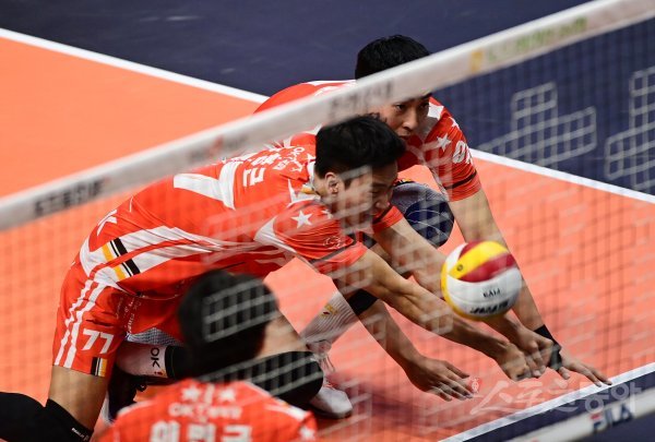 22일 안산 상록수체육관에서 열린 ‘2022-2023 도드람 V-리그’ 남자부 안산 OK금융그룹과 인천 대한항공의 경기에서 OK금융그룹 송명근과 차지환이 리시브 과정에서 충돌하고 있다.