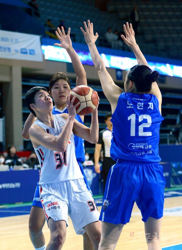 22일 아산 이순신체육관에서 열린 ‘신한은행 SOL 2022~2023 여자프로농구’ 우리은행과 BNK 썸 경기에서 BNK 썸 진안이 우리은행의 수비를 뚫고 골밑을 공격하고 있다.