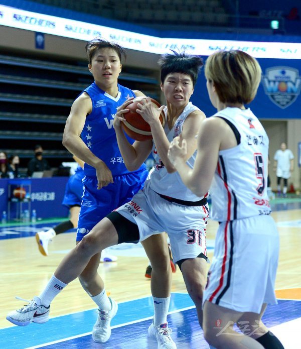 22일 아산 이순신체육관에서 열린 ‘신한은행 SOL 2022~2023 여자프로농구’ 우리은행과 BNK 썸 경기에서 BNK 썸 진안이 리바운드 볼을 잡고 있다.