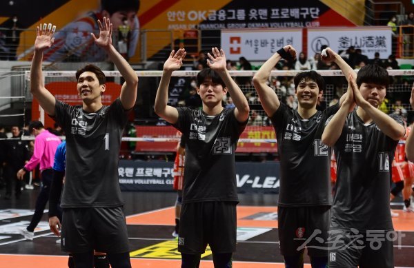 22일 안산 상록수체육관에서 열린 ‘2022-2023 도드람 V-리그’ 남자부 안산 OK금융그룹과 인천 대한항공의 경기에서 세트스코어 3-0으로 승리한 대한항공 선수들이 팬들에게 인사하고 있다.
