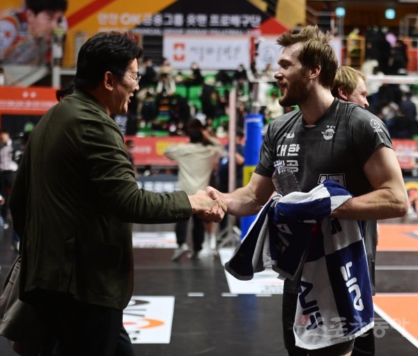 22일 안산 상록수체육관에서 열린 ‘2022-2023 도드람 V-리그’ 남자부 안산 OK금융그룹과 인천 대한항공의 경기에서 세트스코어 3-0으로 승리한 대한항공 링컨이 조원태 구단주로부터 축하를 받고 있다.