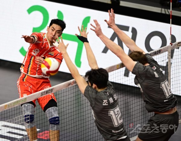22일 안산 상록수체육관에서 열린 ‘2022-2023 도드람 V-리그’ 남자부 안산 OK금융그룹과 인천 대한항공의 경기에서 OK금융그룹 차지환이 대한항공 블로커 앞에서 스파이크를 하고 있다.