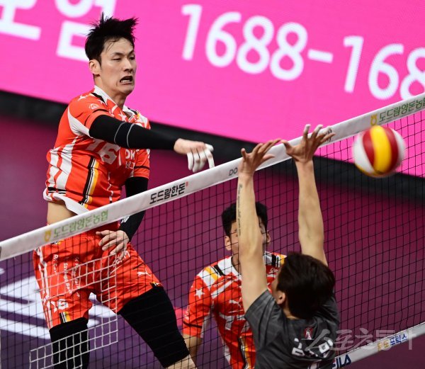 22일 안산 상록수체육관에서 열린 ‘2022-2023 도드람 V-리그’ 남자부 안산 OK금융그룹과 인천 대한항공의 경기에서 OK금융그룹 진상헌이 대한항공 블로커 위로 스파이크를 하고 있다.