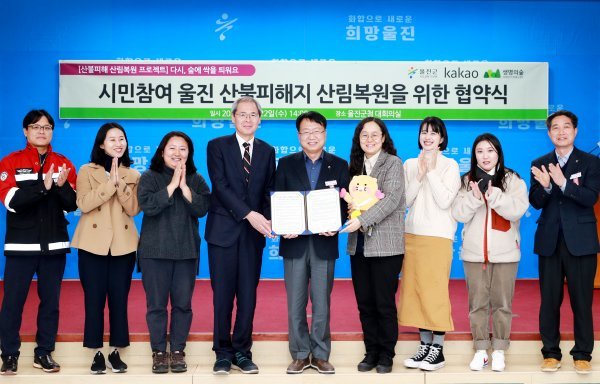 경북 울진군과 사단법인 생명의 숲, 카카오는 지난 22일 산불피해지 산림복구를 위한 ‘시민 참여 울진 산불피해지 산림복원을 위한 협약’을 체결했다. 사진제공 |울진군
