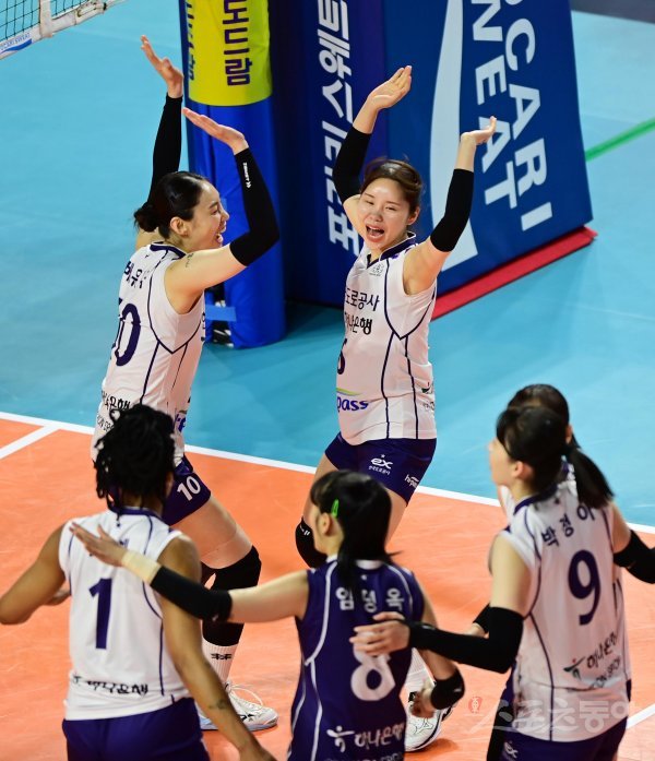 23일 인천삼산월드체육관에서 열린 ‘2022-2023 도드람 V-리그’ 여자부 인천 흥국생명과 김천 한국도로공사의 경기에서 득점에 성공한 한국도로공사 배유나와 이윤정이 기쁨을 나누고 있다.