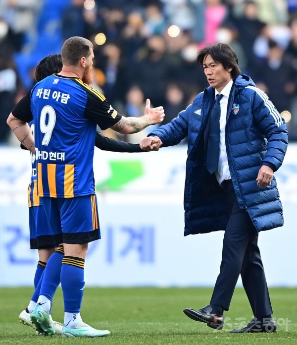 25일 울산문수축구경기장에서 열린 ‘하나원큐 K리그1 2023’ 울산 현대와 전북 현대의 경기에서 2-1로 승리한 울산 홍명보 감독이 선수들과 기쁨을 나누고 있다.