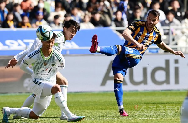 25일 울산문수축구경기장에서 열린 ‘하나원큐 K리그1 2023’ 울산 현대와 전북 현대의 경기에서 울산 바코가 전북 수비 앞에서 슛을 하고 있다.