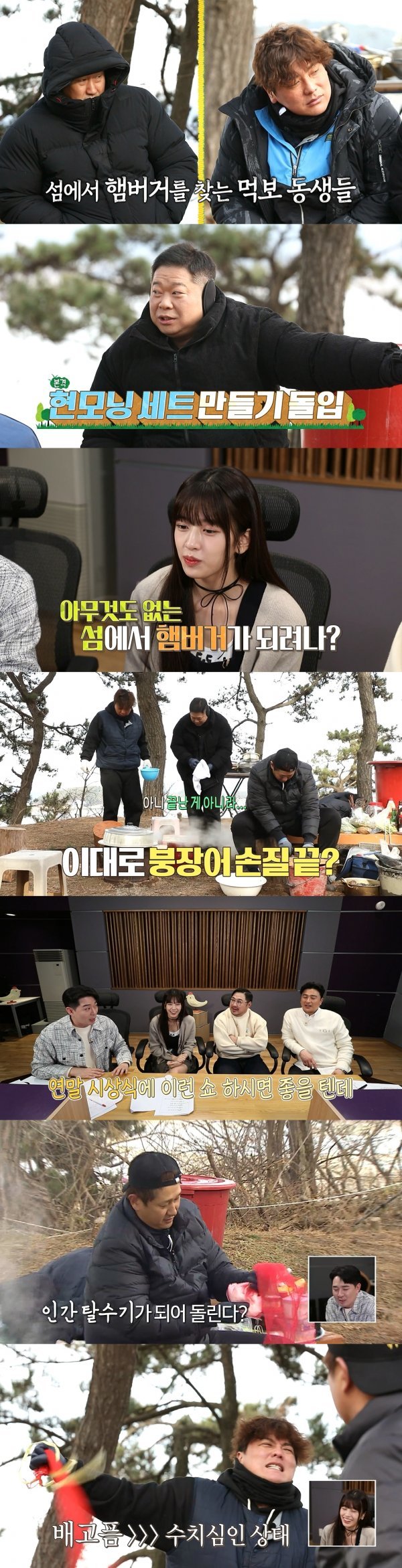 이에 현주엽은 ‘현모닝’(?) 세트를 만들기로 한다. 빵도, 고기도 없는 무인도에서 햄버거가 가능할지 스튜디오 안에서 이를 지켜보던 붐, 안정환 그리고 ‘빽토커’ 안유진과 강재준이 의문을 표한다.