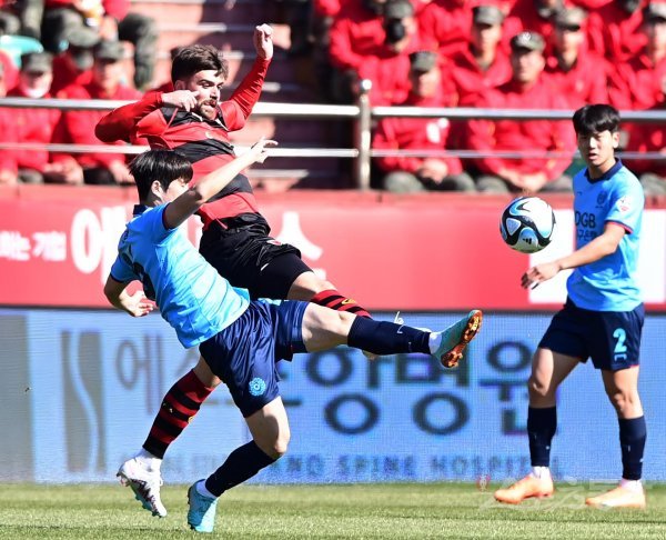 26일 포항스틸야드경기장에서 열린 ‘하나원큐 K리그1 2023’ 포항 스틸러스와 대구FC의 경기에서 포항 제카가 대구의 수비수에게 볼을 뺐기고 있다.