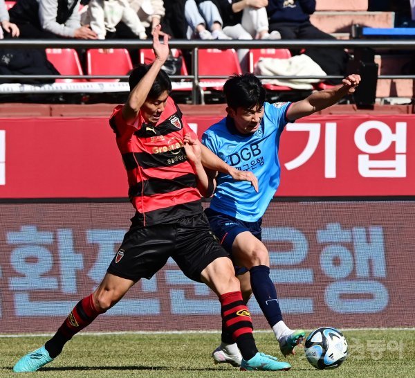 26일 포항스틸야드경기장에서 열린 ‘하나원큐 K리그1 2023’ 포항 스틸러스와 대구FC의 경기에서 포항 박찬용과 대구 고재현이 몸싸움을 하고 있다.